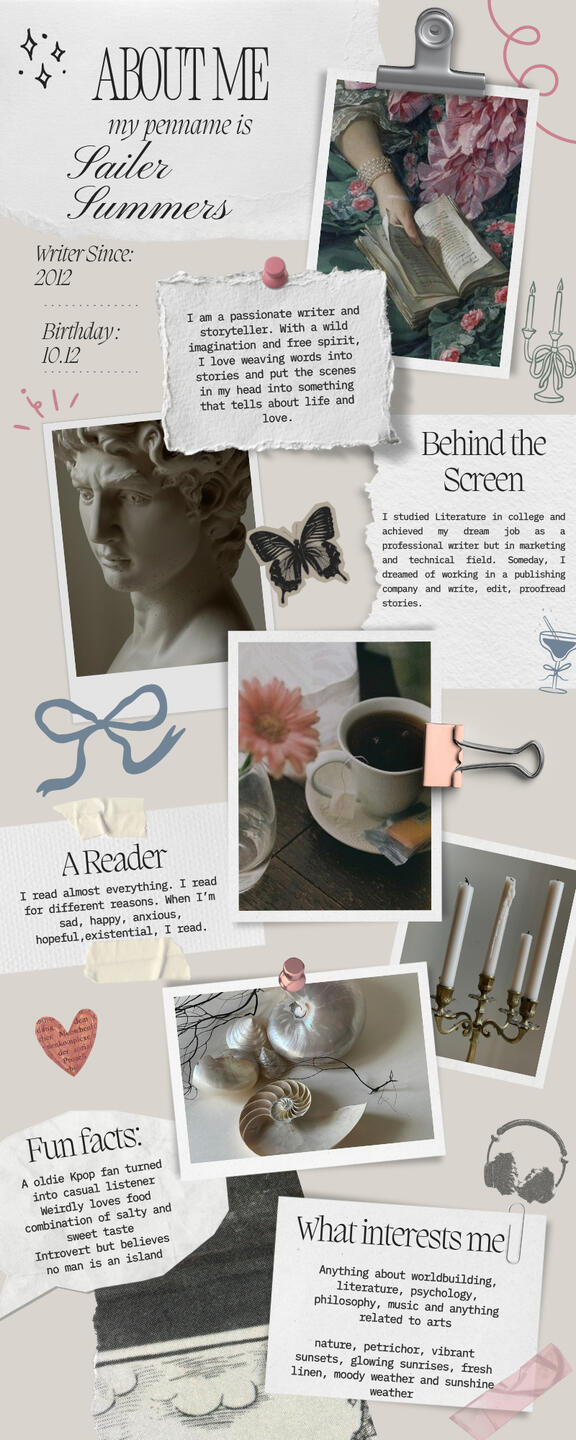 Hi, I'm Sailer. I mostly write slice of life with a tinge of romance stories but I also dabble on other genres and currently I am writing isekai/transmigration/reincarnation stories inspired from reading lightnovels and webnovels. I am a fan of character-driven stories and that reflected my old stories and now, I tried writing stories that are focus on the plot.Some of my stories weren't found in my writing platforms and you can check them out here and feel free to download. They are free but please refrain from selling them as yours. Once I got some information that my stories were spread that involves soliciting money from readers, I will gatekeep them for myself. Only my Carrd visitors will have access to it. My longer novels or stories were posted in Wattpad and others in Ko-Fi. Feel free to visit my profile. They are all free.My stories are not perfect. They may contain typographical errors, grammatical errors, inconsistencies and such. Most of my stories are first drafts and are subjected to editing and proofreading.Credits to the rightful owners of the photos that I used in my stories, including the references, book covers, moodboards, etc., as well as the song lyrics.For readers, thank you for adding my stories to your reading lists. I sometimes reply to your comments and happy with your reactions. I really, really appreciate your support.